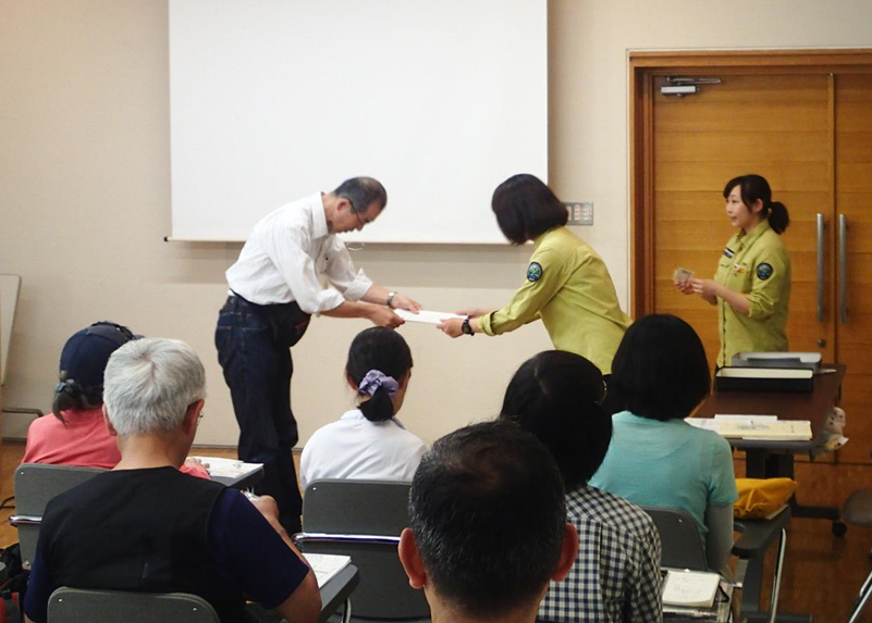 認定式では1名ずつ名前を呼ばれ、レンジャーから認定証を授与、そして携帯認定証、パークボランティアのワッペンを賞与されます。ここからようやく8期生の活動が開始となります!