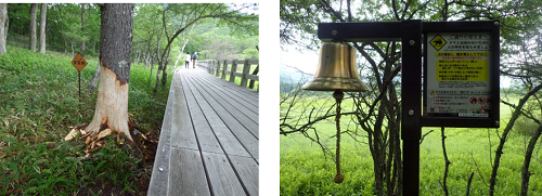 私たちが重点的に見回りを行っている奥日光エリアも例外ではなく、7月17日に発見された木道脇のクマはぎをきっかけに、クマ除けのための鐘を設置することになりました。