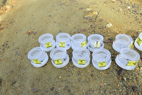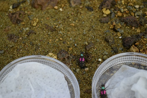 1. ハンミョウの入ったケースをハンミョウが産卵に好みそうな裸地に置きます。