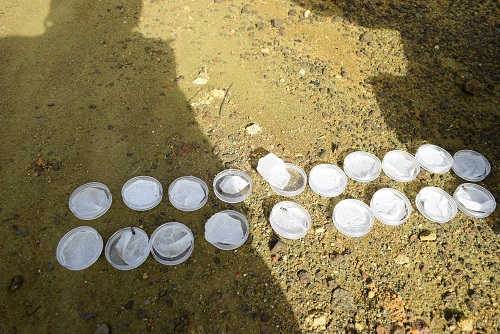 今回は合計57匹の成虫を、かつての生息地2箇所に放しました。背中についているピンクや緑色は、放虫時期や場所、性別などを識別し、行動を観察するために付けたマーカーです。