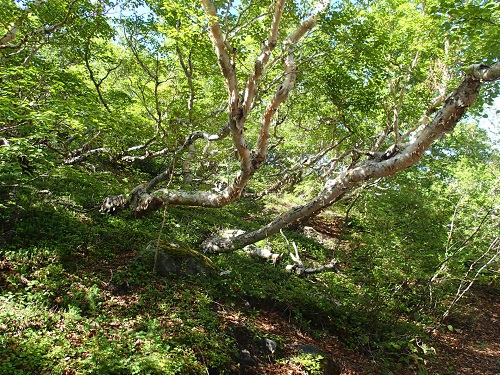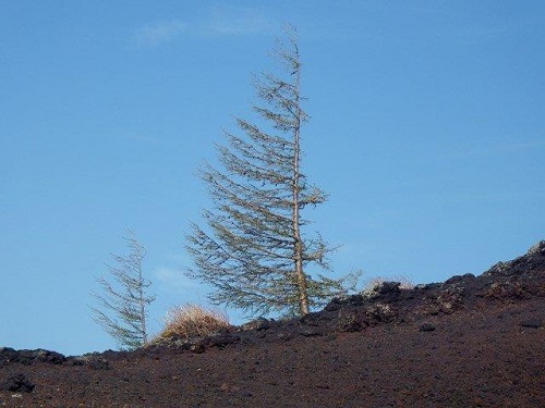 冬の厳しい風で風上の枝が枯れ、風下の枝だけが残った"旗型樹型"