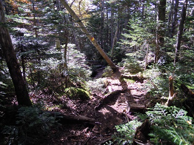 帝釈山を過ぎて下りに入るとオオシラビソを主体とする針葉樹林の中の道で、