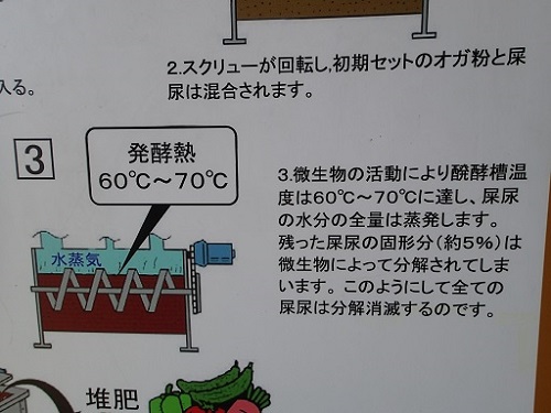 3.微生物の活動による熱で発酵槽の中の温度は60℃~70℃になります。し尿の水分は蒸発し、固形分は微生物によって分解されます。