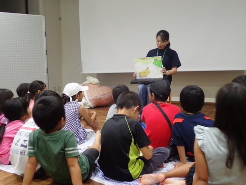 読み聞かせで紹介しました。マイマイの飼育スタッフが作成した暖かみのある手作り紙芝居で、