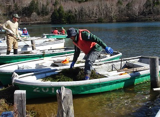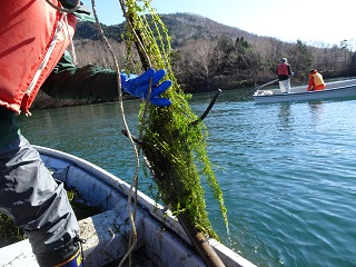 場所によって捕れる量が違い、碇に少し引っかかるだけの時もあれば、抱えるようにボートに引き上げる時もあり、大量のコカナダモを引き上げている様子は、まるで海で漁をしているようでした。