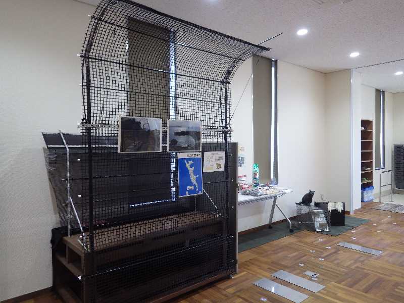 イベント当日はパネル展示の他、実際に使用している捕獲カゴなども展示しました。
