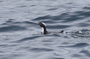 カンムリウミスズメは、繁殖期以外のほとんどの時間を海上で過ごす泳ぎのプロです。潮目で獲物を捕らえるために潜水する姿も見られました。
