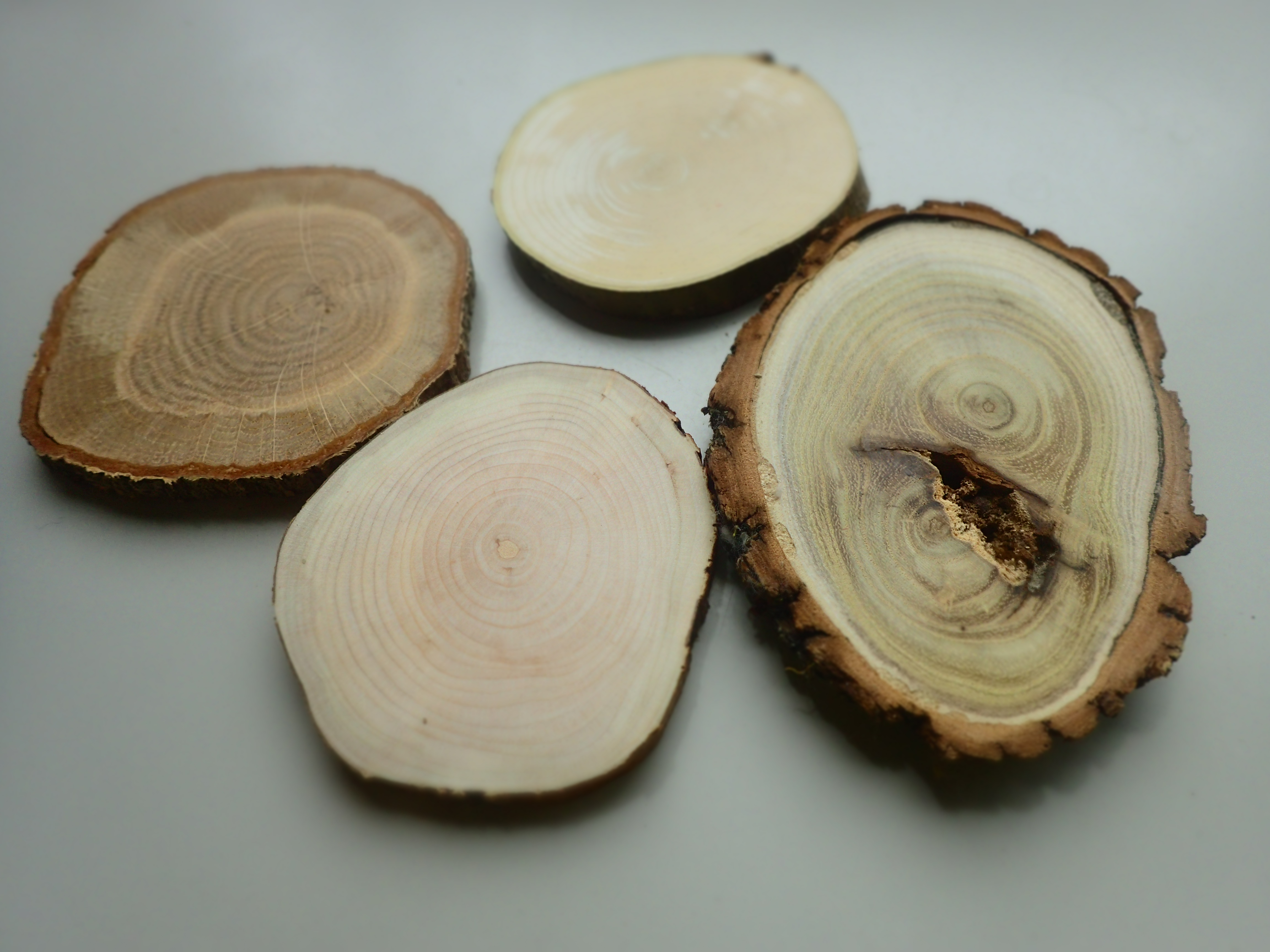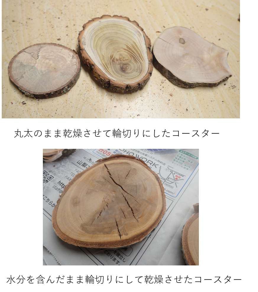 昨年のこの時期に今年作成する分の木の調達に行きました。太すぎると輪切りにする際の丸鋸に入らなくなってしまいますが、細すぎると焼印が押せないので太すぎず、細すぎず、コースターとして使える木を選びました。調達してきた木はすぐに輪切りにせず、倉庫の中で乾燥させます。なぜ、乾燥させるのかといいますと、伐採された直後の木は地中から摂取した水分を大量に含んでいます。伐採すると水分を摂取することができなくなり、乾燥し、膨張伸縮し始めます。水分を含んだ木を輪切りの状態で乾燥させると膨張伸縮が直にかかってしまい、ひび割れや反りに繋がります。その反面、丸太のまま乾燥させると輪切りの状態よりも膨張伸縮の負担が少なく、割れにくく、反りにくくなります。