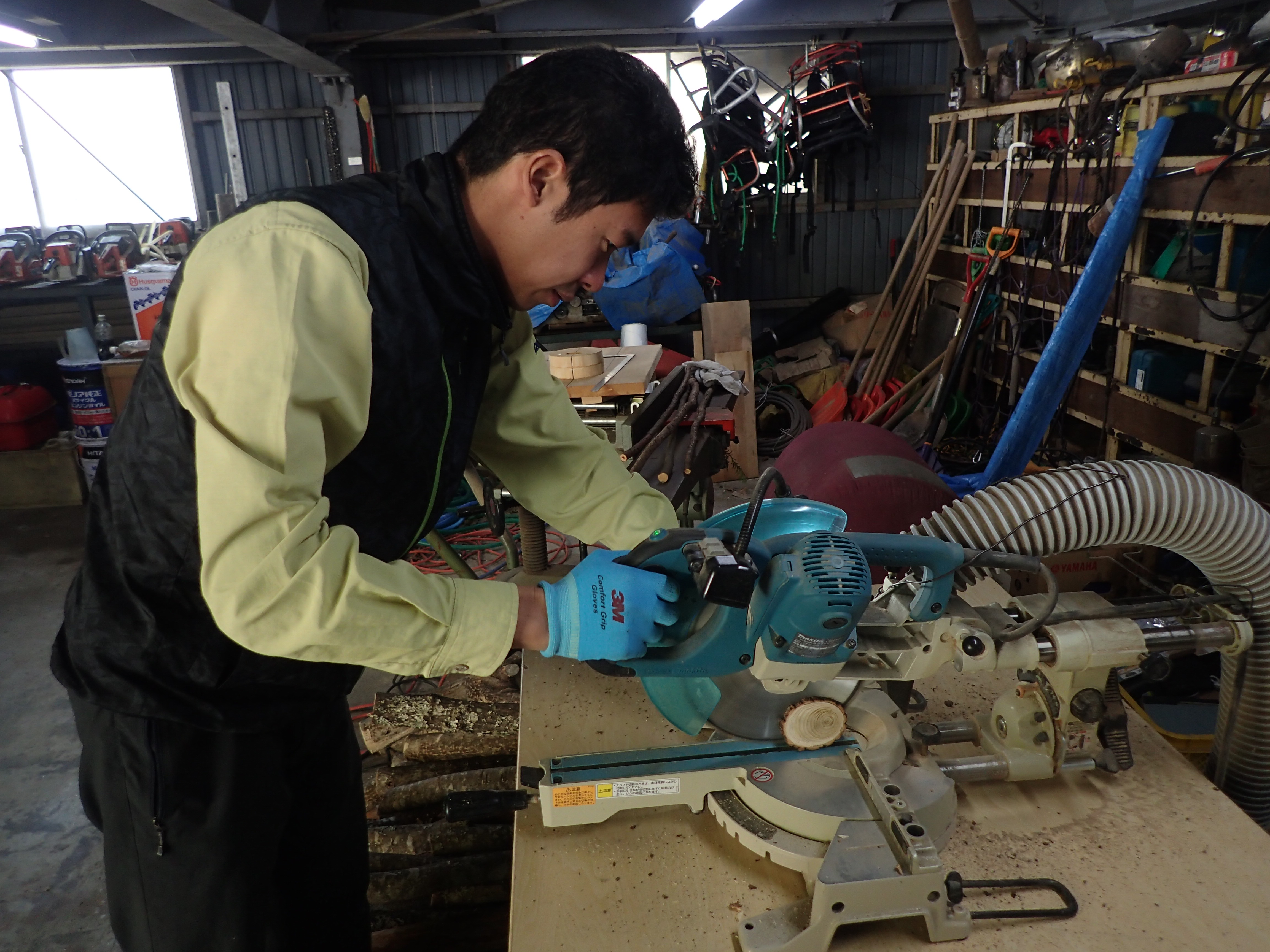 この日は地元の方に協力していただきながら伐採された木材を輪切りにスライスする作業を行いました。