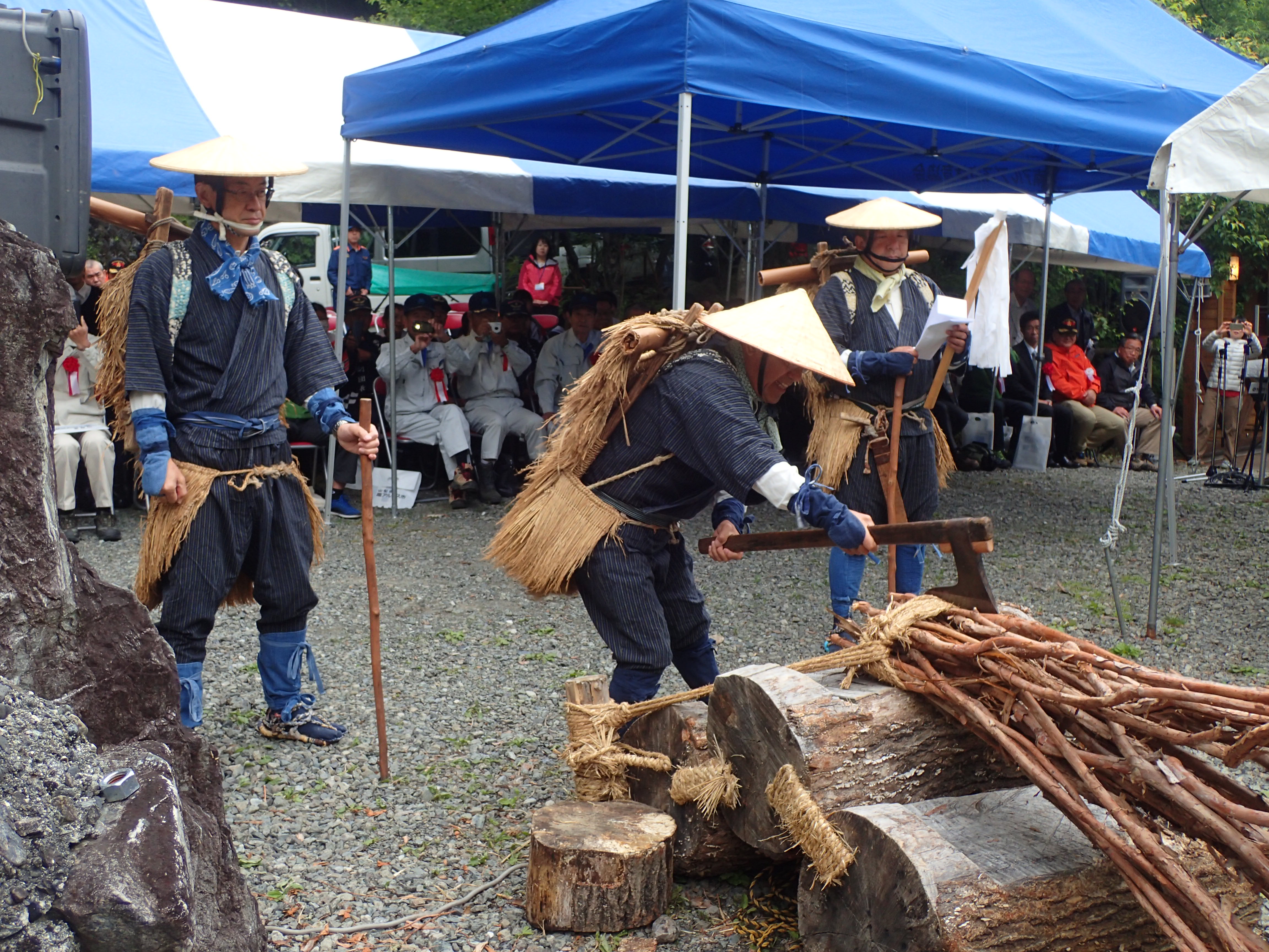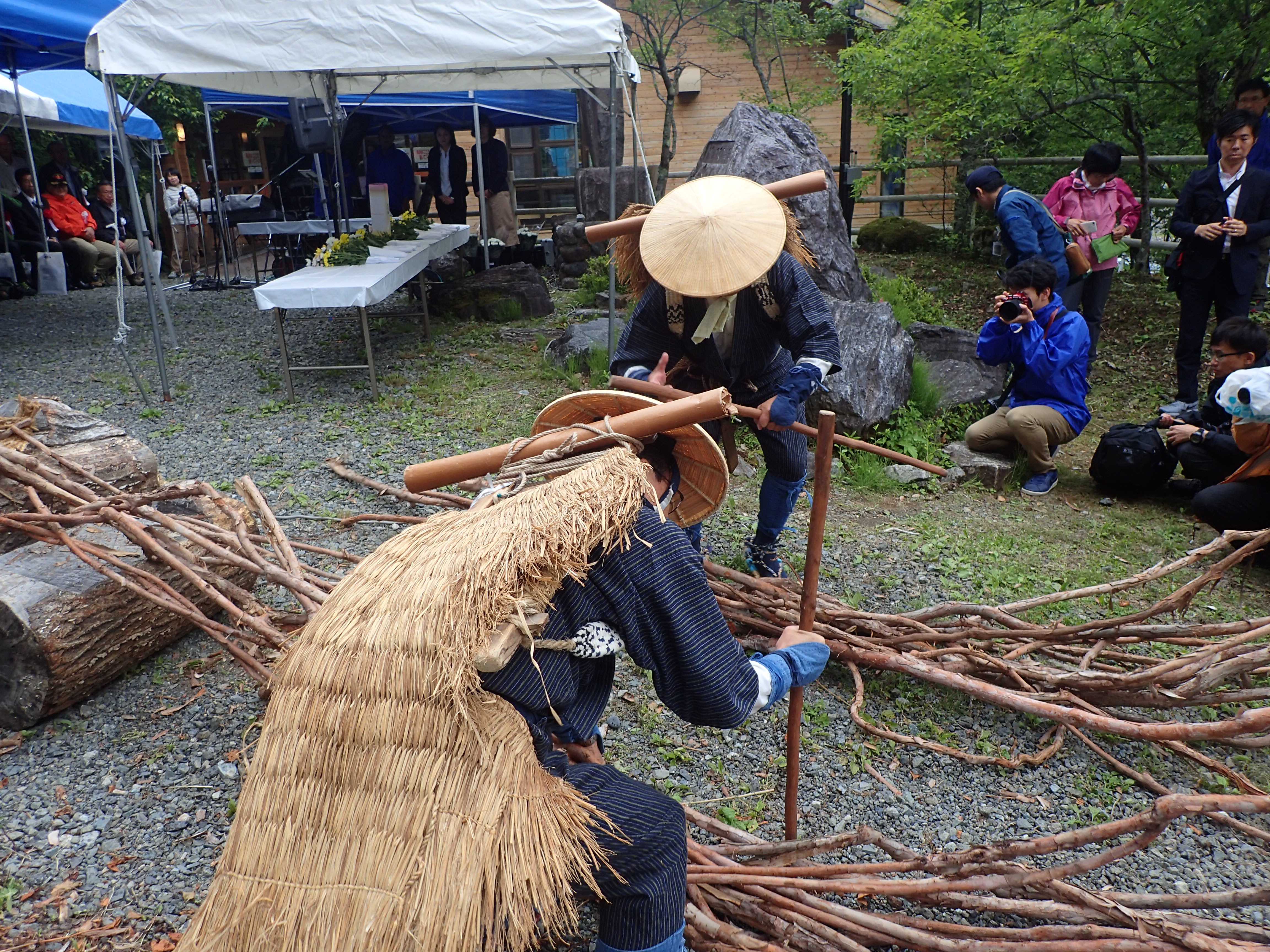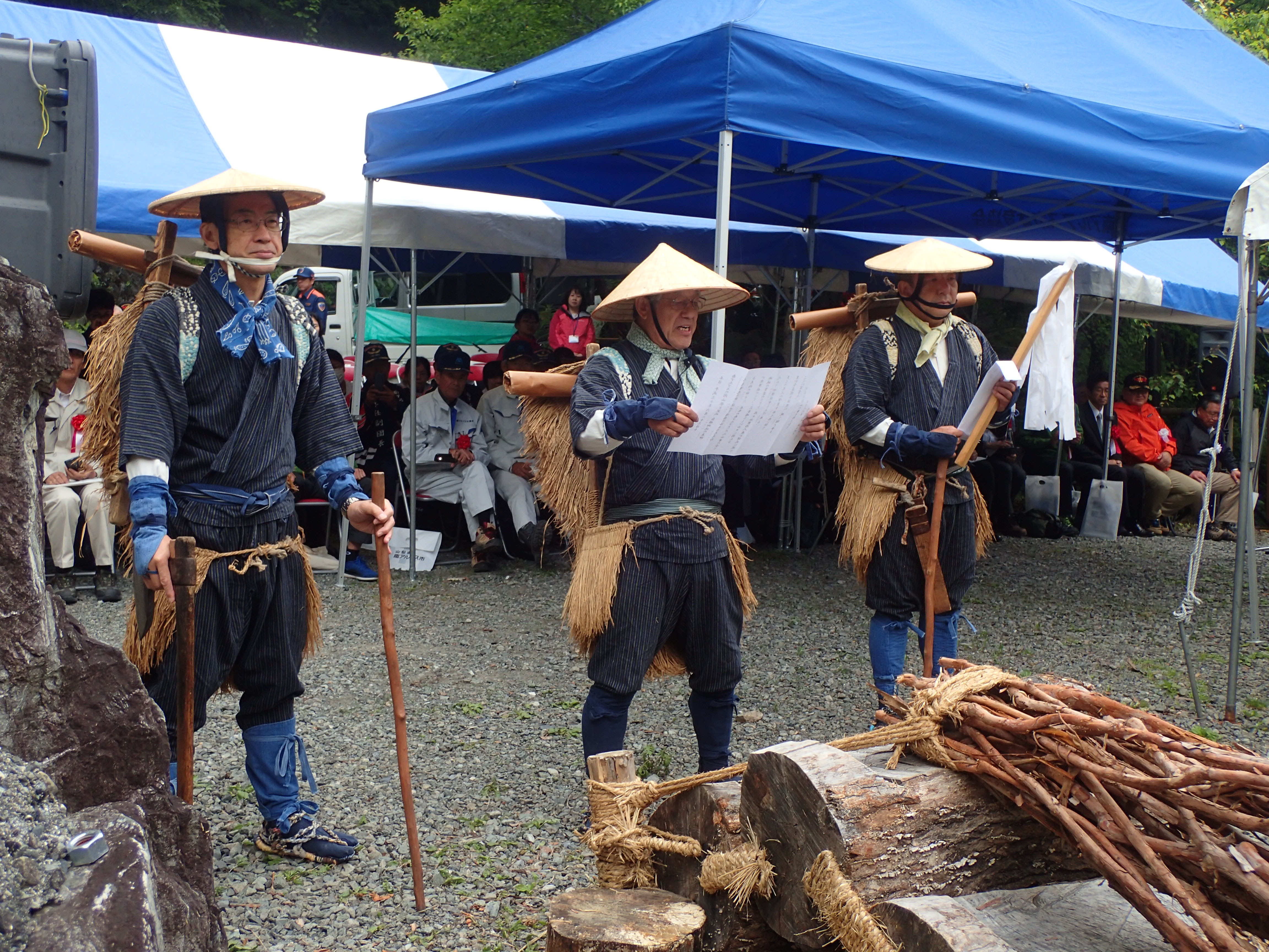 開山祭では地元芦安中学校による合唱や、夜叉神太鼓の力強い演奏が行われました。最後に「蔓払い(つるはらい)」の儀式が行われました。「蔓払い」とは明治時代の「山の案内人」のイメージした格好で登場する案内人が蔓の門を斧で切る儀式のことをいいます。蔓を払うにあたって、山案内人が開山祈願の言葉を述べます。