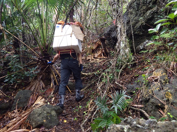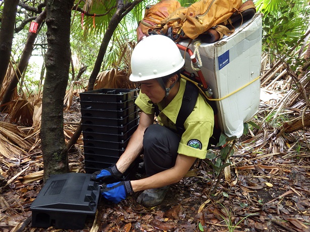 作業は事前に決めておいたルート上にベイトステーションを設置していきます。もちろん、整備された道ではないので、作業中、足下には十分注意します。なぜなら、何気ないところでも落ち葉の下には固有のカタツムリがたくさん生息しているからです。作業によって、カタツムリへの影響を及ぼすことのないように気を配ります。この日は約80個のベイトステーションを設置し作業が終わりました。今後は殺鼠剤の補充や痕跡の確認、調査などが始まります。