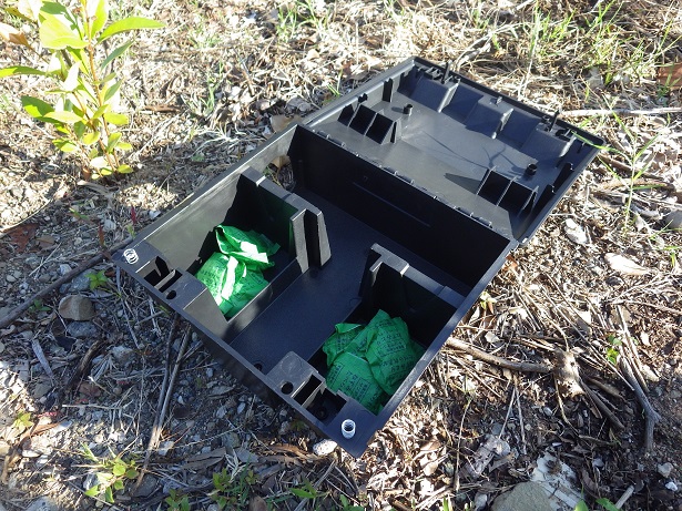 〉ベイトステーション。両端に入り口があり、ネズミがそこから入って、中の殺鼠剤を摂食するという仕組みとなっています。