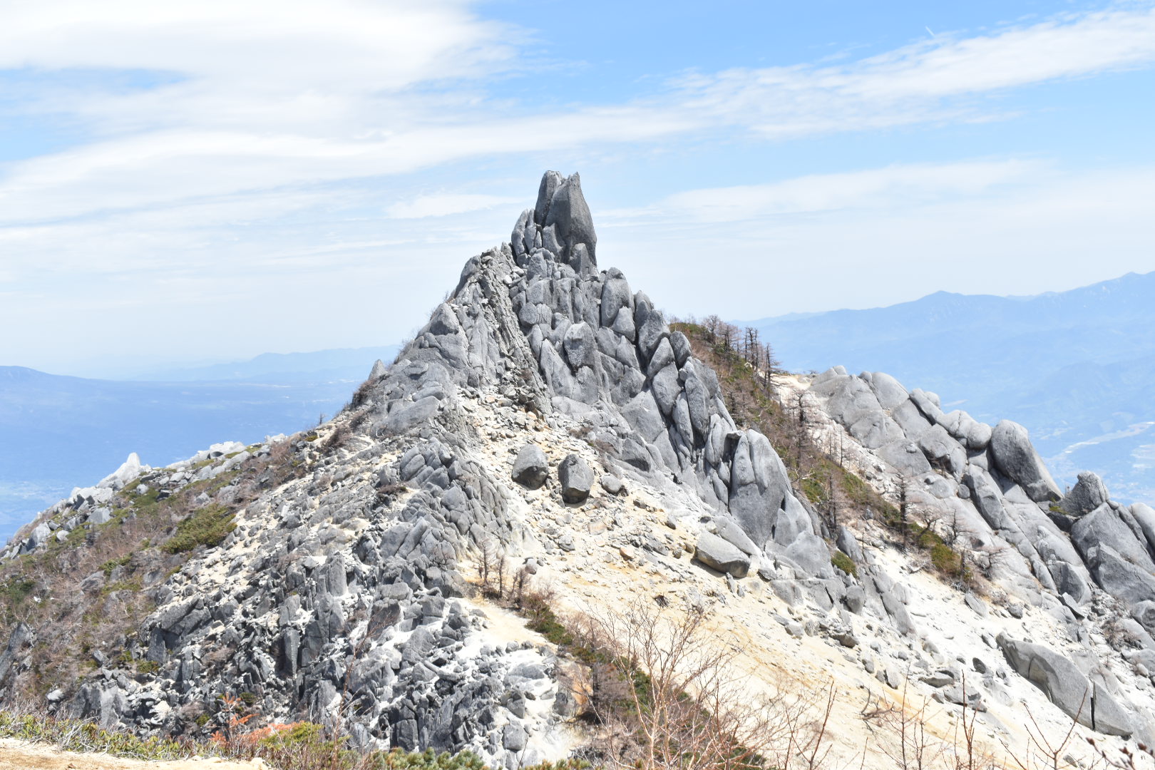 この岩の塊は地蔵ヶ岳にある高さ約20m、通称「オベリスク」と呼ばれる大石柱です。鳳凰三山のシンボルといえるでしょう。明治時代にW・ウェストンが初登攀したことでも知られています。鳳凰三山は薬師岳(2,780m)、観音岳(2,841m)、地蔵ヶ岳(2,764m)の三山から成る山で、日本百名山、山梨百名山に選出されています。