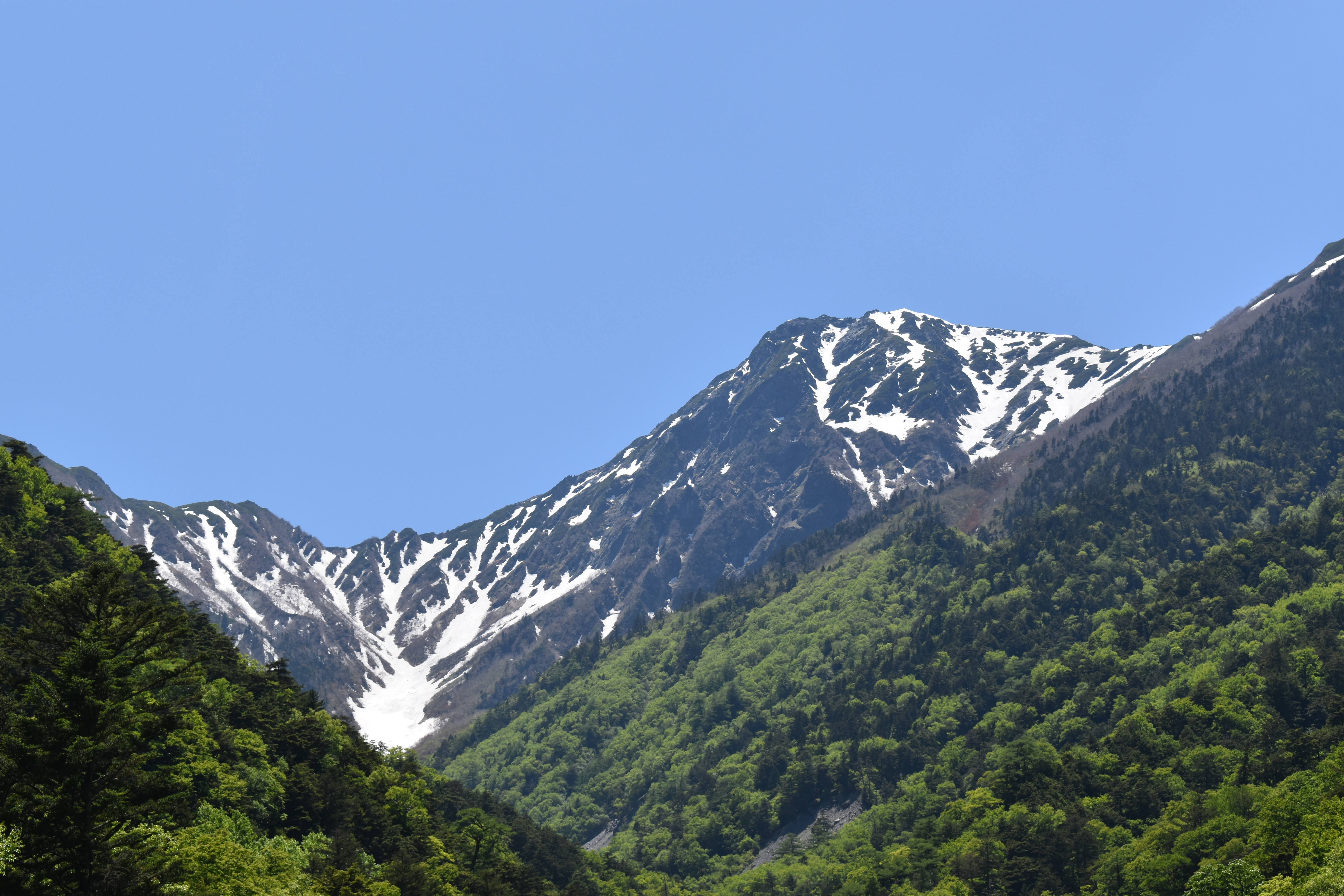 この日は雲一つなく、北岳山頂がよく見えました。昨年は遅くまで雪が残り、雪が多いといわれ、その反面、今年は雪が少ないといわれています。ですが、大樺沢左俣(鞍部下の雪が残る場所)はご覧の通り、真っ白です。雪の量は例年通りです。ご自身の体力、技量に合わせてルート選びをしてください。いよいよ南アルプスの山開きですね。ぜひ、南アルプス国立公園へお越しください。