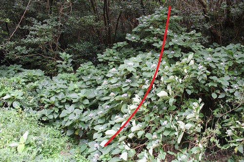 伊豆諸島ではこの2種のアジサイがセットで分布することが多く、沢筋の不安定な立地等に群落を作ります。林の縁にもよく自生しているので、山側の車道を通れば簡単に見つかります。