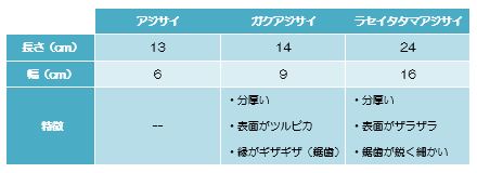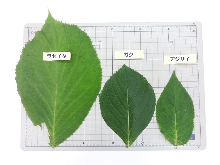 これは、ラセイタタマアジサイ(左)とガクアジサイ(中央)と一般的なアジサイ(右)の葉っぱを比較してみたものです。