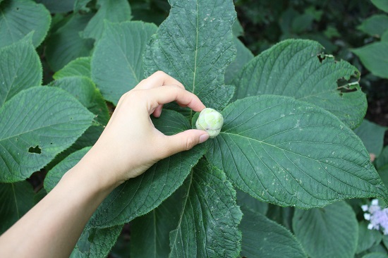 全ての蕾が開ききっても、ラセイタタマアジサイの花は葉っぱに足して小振りなものです。