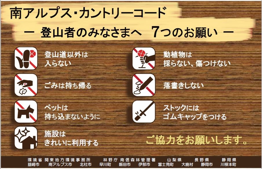 常に快適で安全な登山を心がけていただくとともに、我が国屈指の山岳国立公園である南アルプスの大自然を大切に守り、後世に引き継ぐために、『南アルプス・カントリーコード -登山者の皆様へ7つのお願い- 』を利用者の皆様へお願いしています。