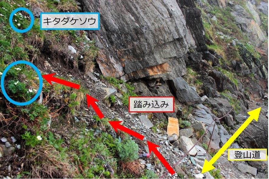 お花畑へ踏み込むと、植物が踏みつぶされて失われてしまいます。そして地面がむき出しになると、土壌が流れ出し、その場所や周辺には植物が生えにくくなってしまいます。一度失われた植生は回復までにかなりの時間を要します。
