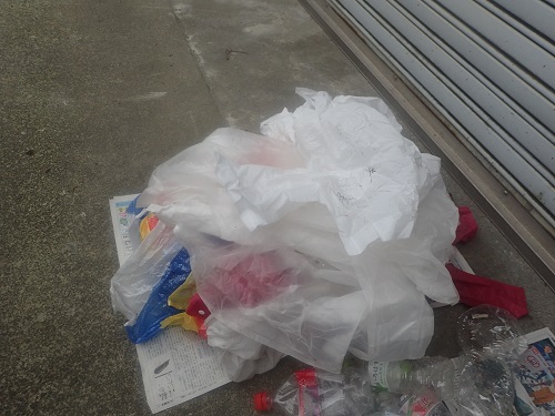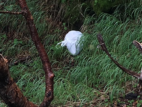 ただ、今回お盆期間中に巡視をした際には少し様子が異なっていました。前回が意図せず落ちてしまったと思われる小さなゴミやウォーキングポールの先端キャップ、手袋などが多かったのに対し、明らかに意図的に投げ捨てたと思われるコンビニ袋に入ったゴミや、使わなくなったビニール合羽を沢山拾いました。
