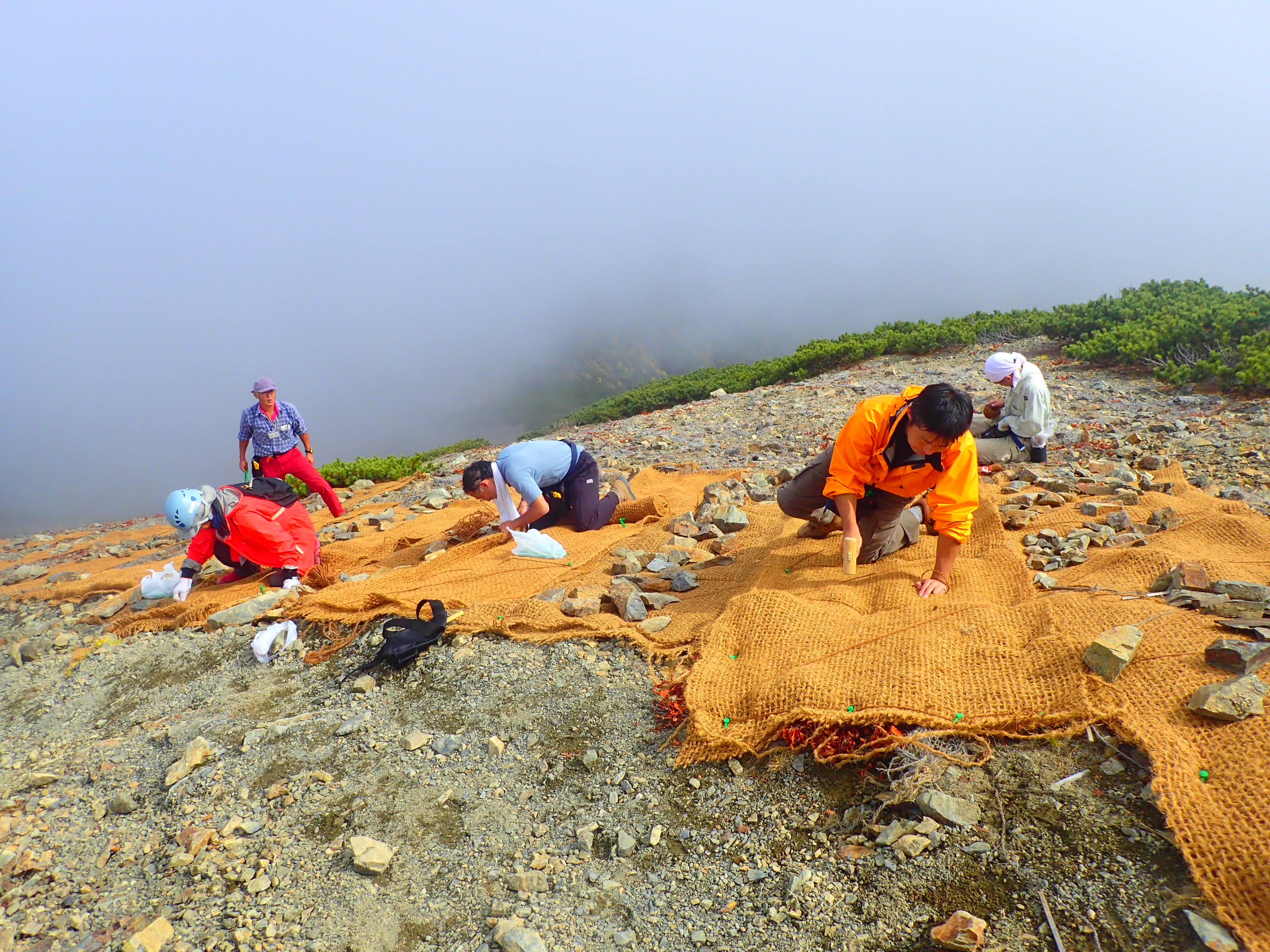 △土壌流出防止のため、マットで覆う作業のようす