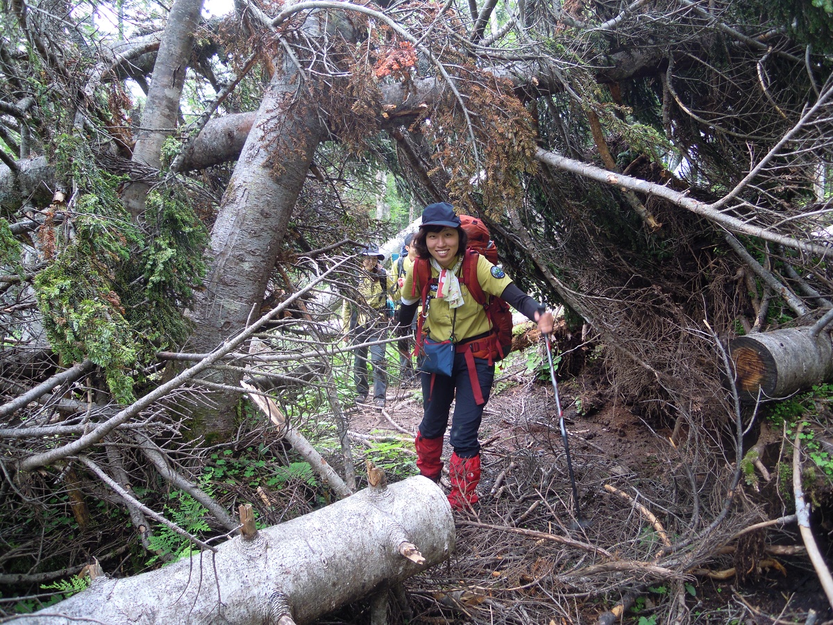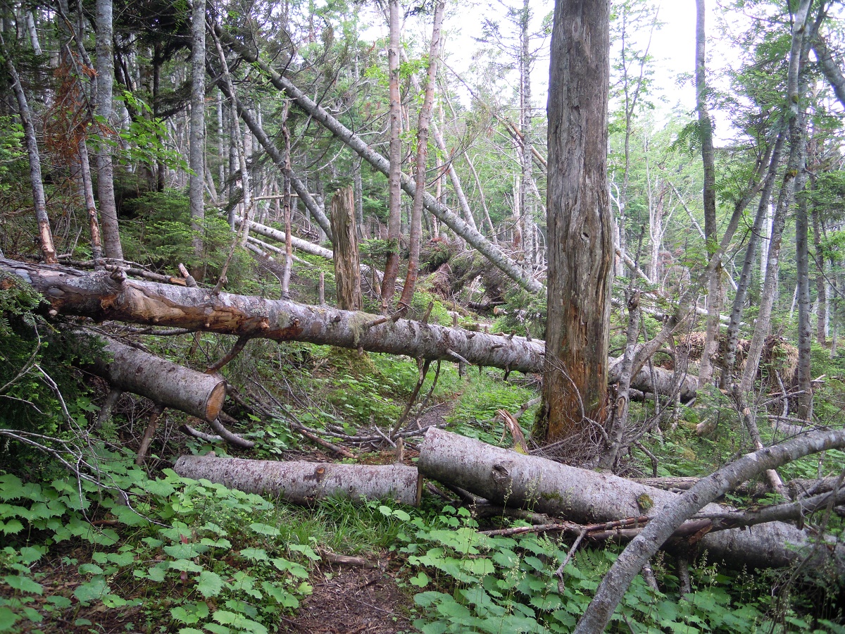 オオシラビソのおそらく風倒木が非常に多く見られます。一部は切断されていますが、跨いだり潜ったりする箇所もあります。