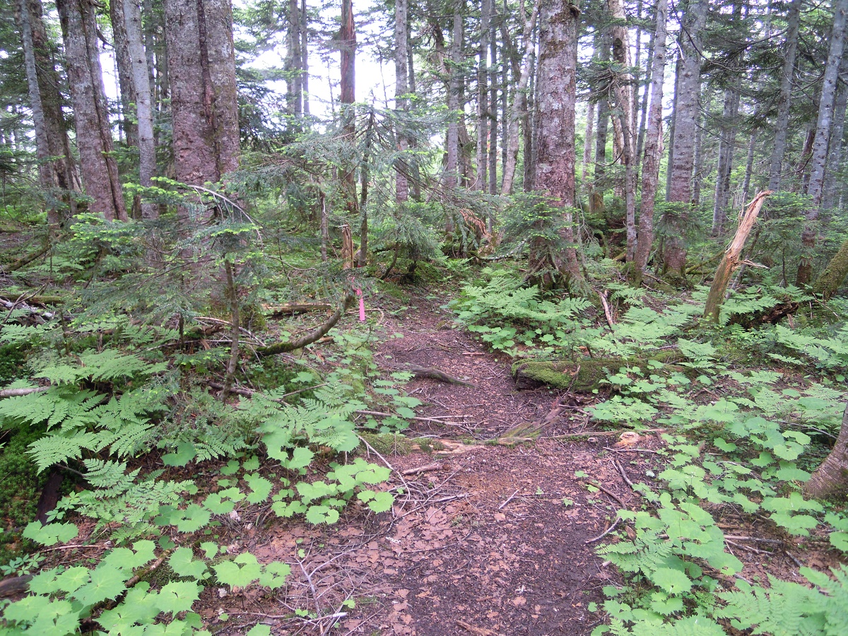 小淵沢田代を過ぎると、また樹林帯に入ります。これから辿る登山道は、オオシラビソを主体にした静かな樹林を抜ける道です。登山道は標高1800m-2000mの間で急な登り下りの少ない、しかし展望がほとんど無い、人によってはツマラナイとも言える道を辿ります。