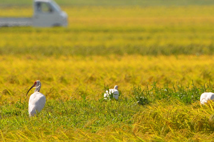 すっかり秋めいて刈田や黄金色の絨毯の中に群れるトキを見かけるようになりました。