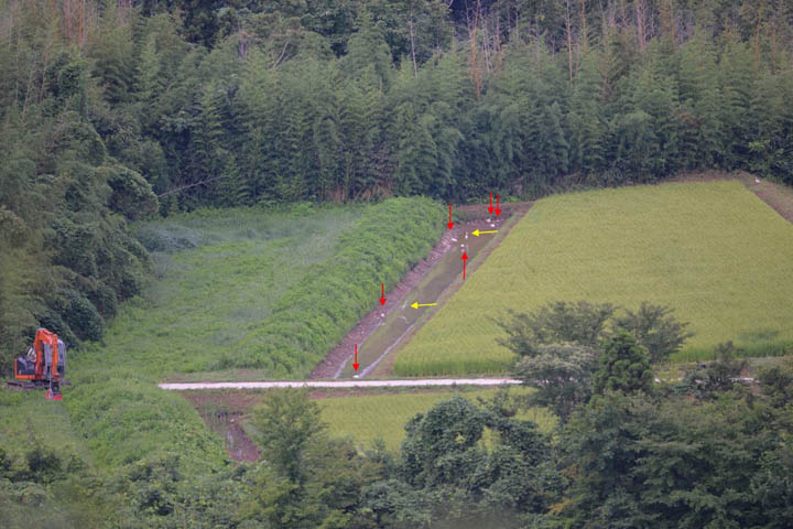 ▲ねぐら出した後に近くの田んぼ(江)に降りた様子(赤矢印:トキ、黄色矢印:サギ)