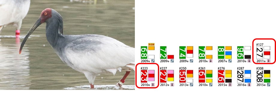 モニタリングではトキの足環の一覧表になっている識別表を使って、個体を特定しています。写真の個体の左はピンク・赤・ピンクのNo.223、右は白・赤・白のNo.127とわかります。この足環の判読やねぐら出カウントによるデータの積み重ねにより、現在は353羽(佐渡島内351羽、本州2羽)の生息が確認されています。その内の257羽には足環が装着されています。すごいのは足環のある個体はどこにいるかほぼすべて追えているということです!! 10年前の2008年9月25日に佐渡で放鳥が始まりました。この10年でトキの数は順調に増えており、佐渡における生息場所も範囲を広げています。これからの10年はどんな年になっていくでしょうか。人とトキが共生してける社会の実現のお手伝いが少しでもできるように引き続きモニタリングを通して観察していきたいと思います。