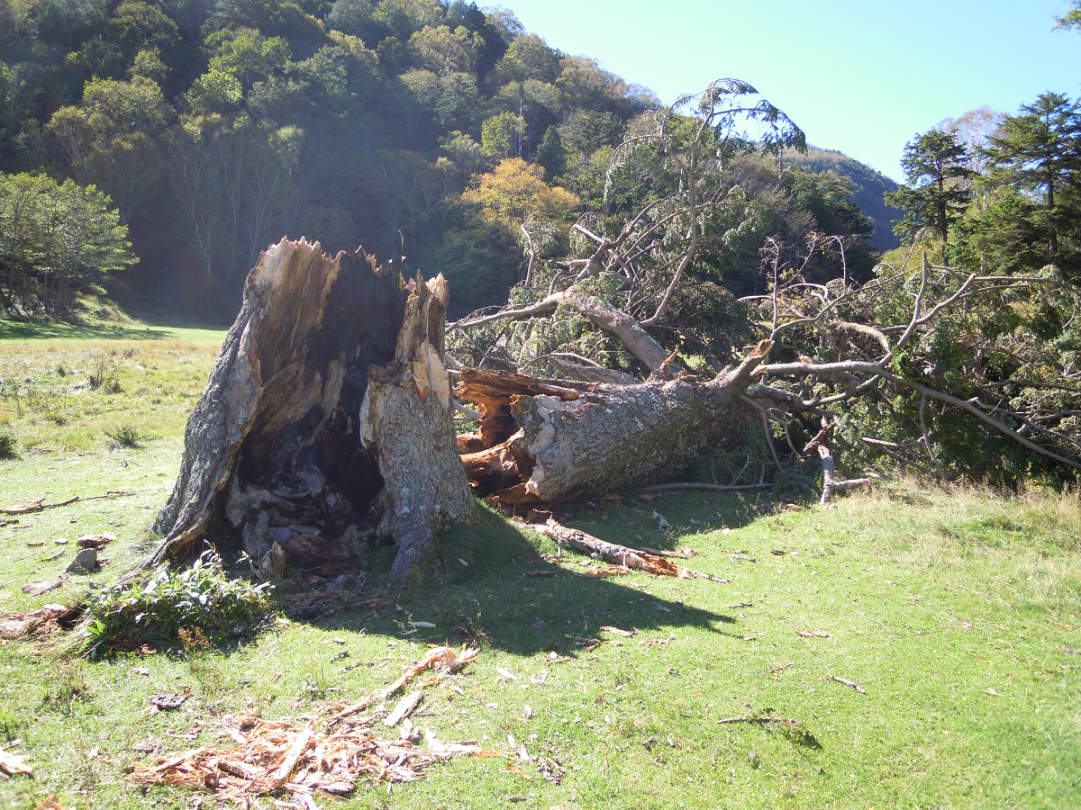 他にも中禅寺湖の西側の千手が原の森でも、数本の巨木が倒木しました。これらの樹木は、奥日光の景観を構成する大事な巨木だったので残念ですが、良く観察すると樹幹に腐朽が入り、空洞等がある木がほとんどでした。