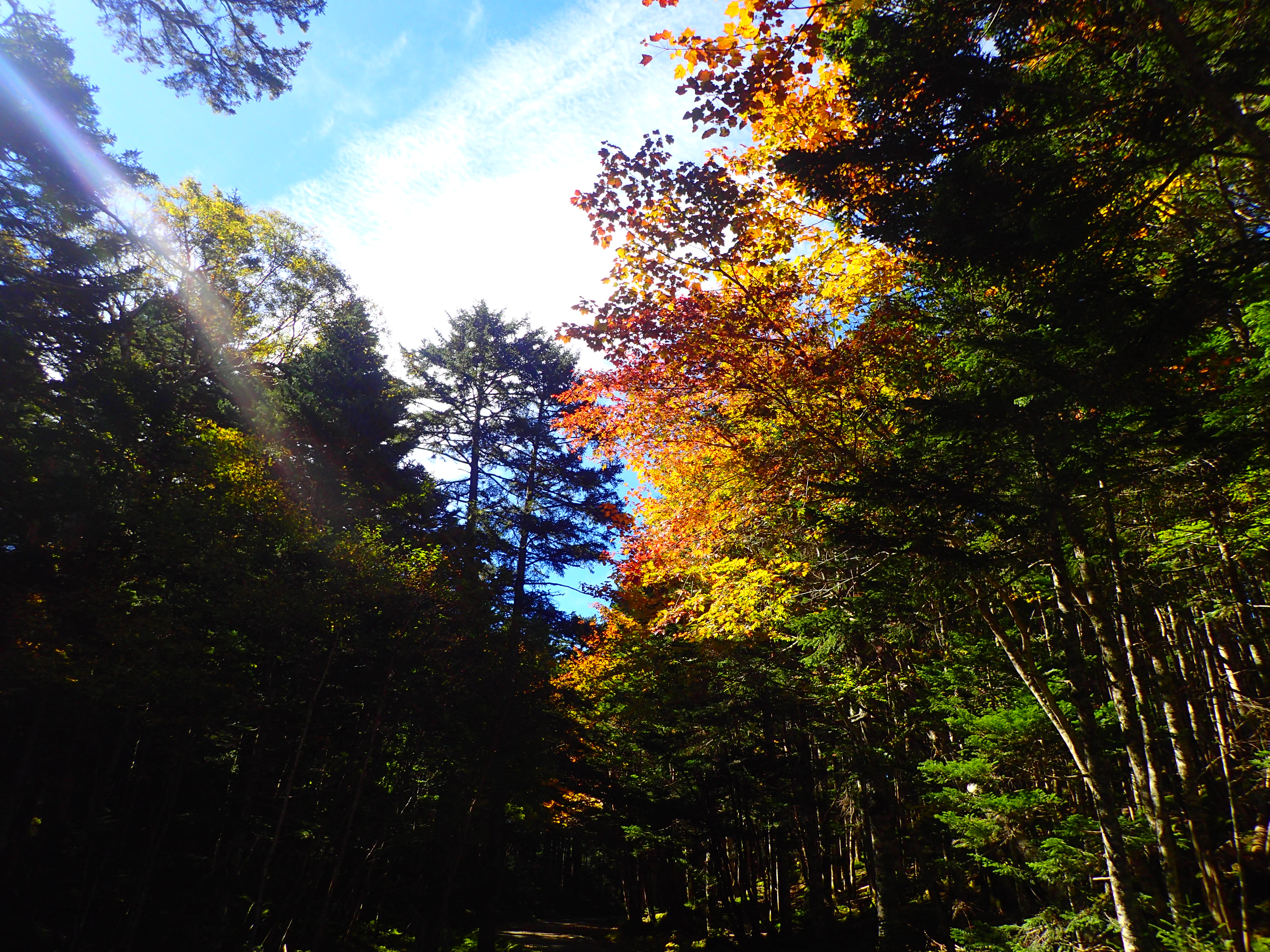 北沢峠はシラビソやトウヒなど紅葉しない樹木が多いですが、ところどころで赤や黄色に樹木が染まっており、絵の具で塗ったような見事な色付きでした!空を見上げると太陽の日差しでより綺麗に見ることができますよ♪この日は1日中太陽が出ていましたが、標高2,000mほどの北沢峠ではフリースを着ていても少し肌寒く感じました。お越しの際は暖かい格好で来てくださいね。