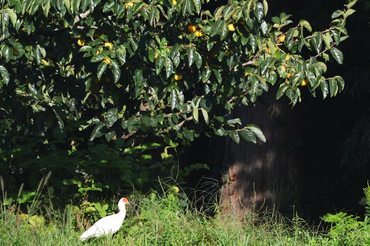 ▲柿畑で採餌するトキ(2018/9/28撮影)