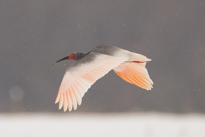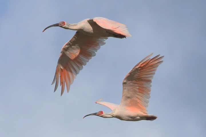 私は繁殖期の方がより長い時間観察をしていることもあってか、繁殖羽のトキがしっくりきます。繁殖羽は営巣する林の中でカモフラージュの役目もあるようで、刈田にいても背景と同化して見逃しそうになることがあります。一方で今年生まれの幼鳥は冬になっても繁殖羽にはならず、とき色が成鳥に比べると薄いため群れで飛翔していても見分けることができます。