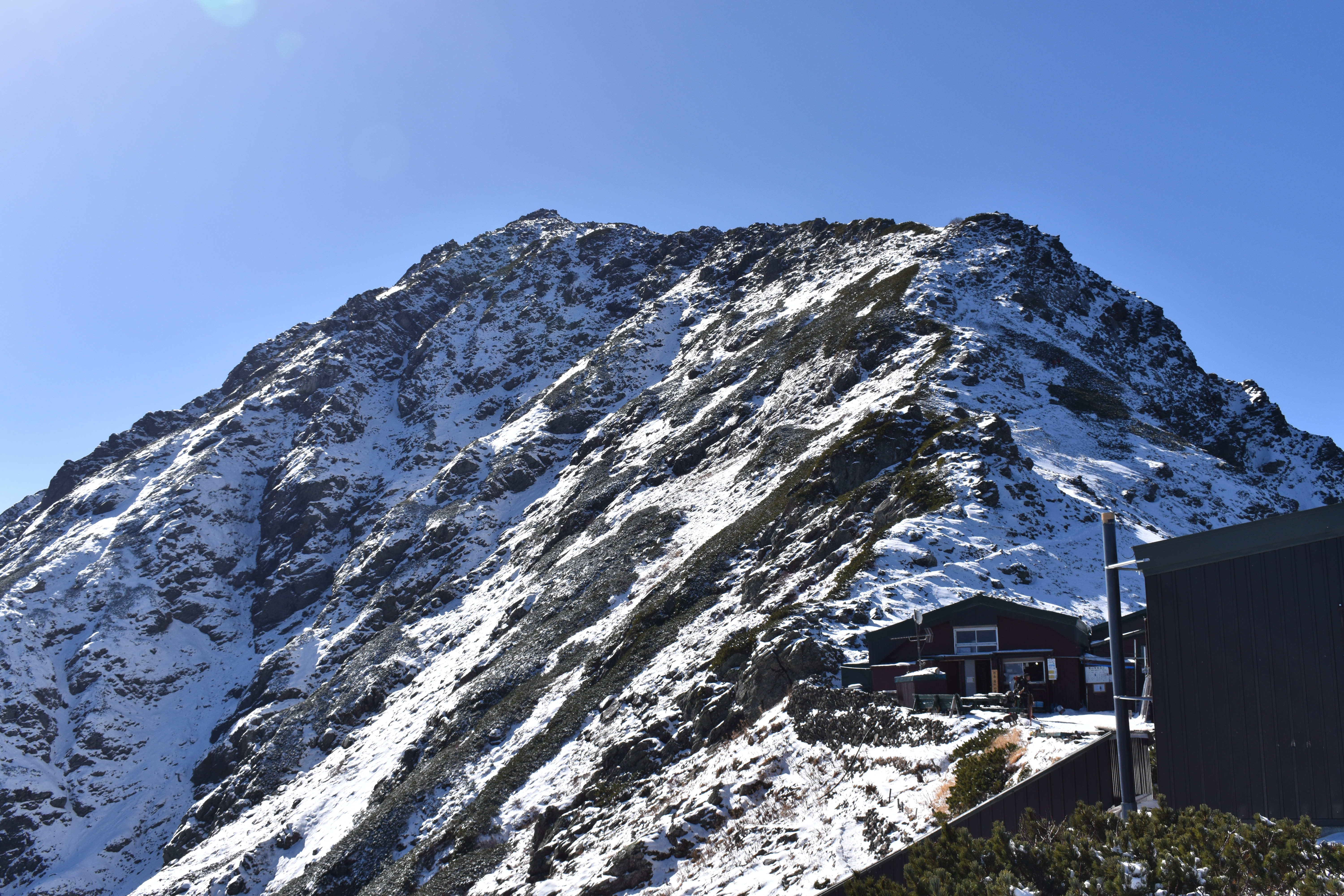 北岳肩ノ小屋はおよそ標高3,000m。この日は日が射しているもののやはり寒かったです。これまで夏に見ていた北岳とは打って変わって、雪で白くなって、より山体の大きさを感じることができます。ここから先は雪が積もっているところや岩がむき出しになっているところがあります。アイゼン等の雪山装備を必ず準備して登るようにしてください。
