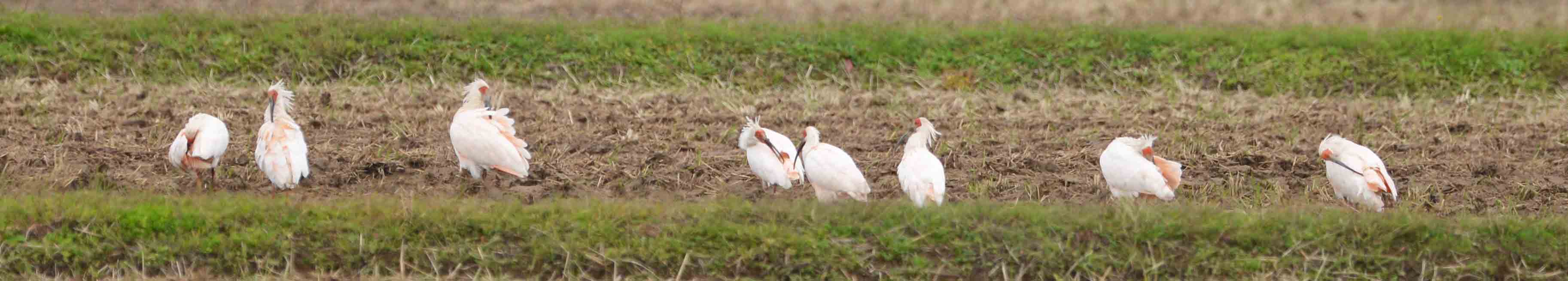 ▲佐渡市新穂地区の刈田で羽繕いをするトキ8羽(2018年10月29日)