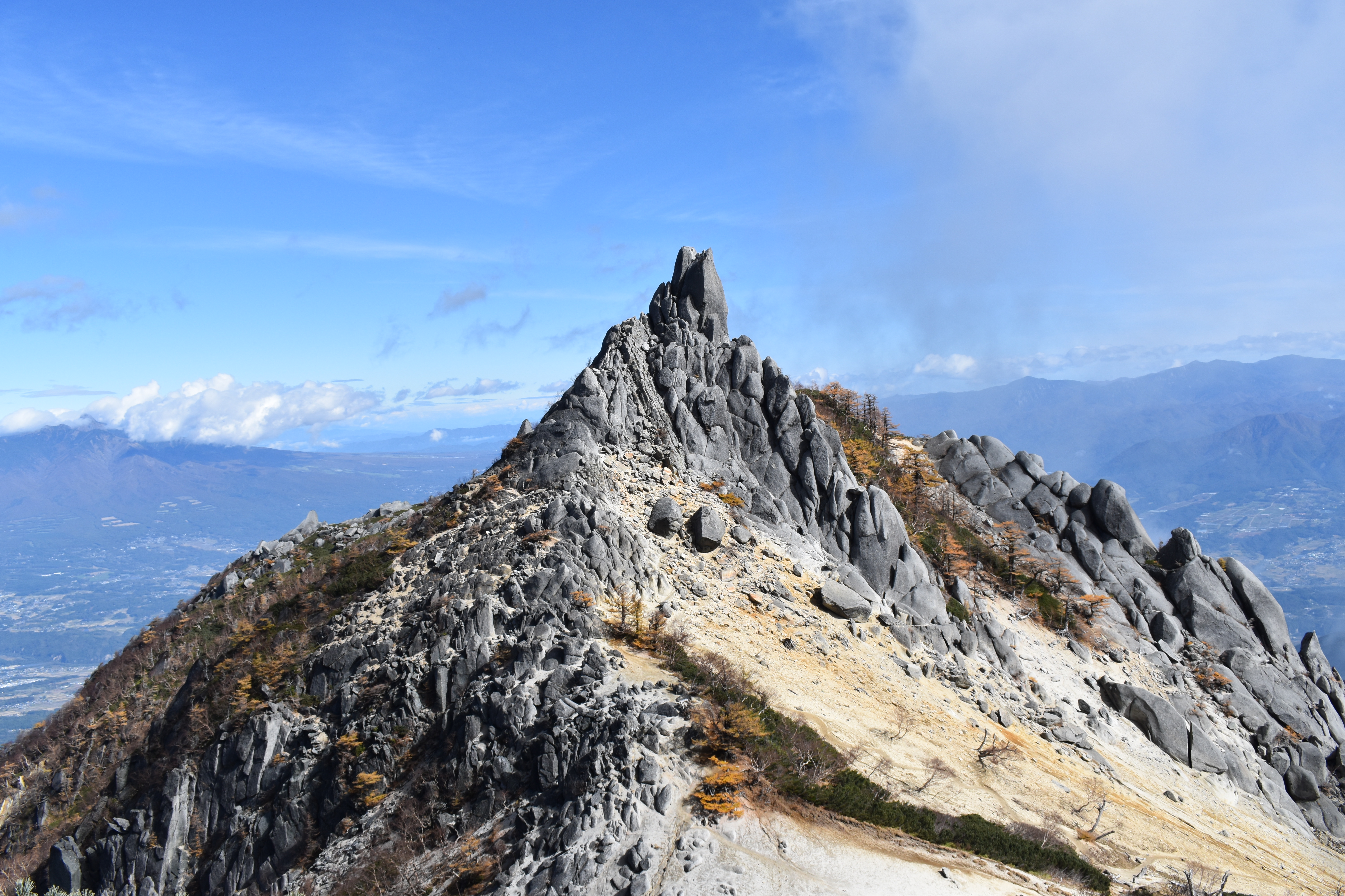 どうでしょう!このダイナミックなオベリスク!ほんの少しですが、紅葉している木があり、この時期ならではの光景です。赤抜沢の頭に着く頃には、どんよりしている雲は無くなり甲斐駒ヶ岳や仙丈ヶ岳、八ヶ岳連峰もよく見えました。