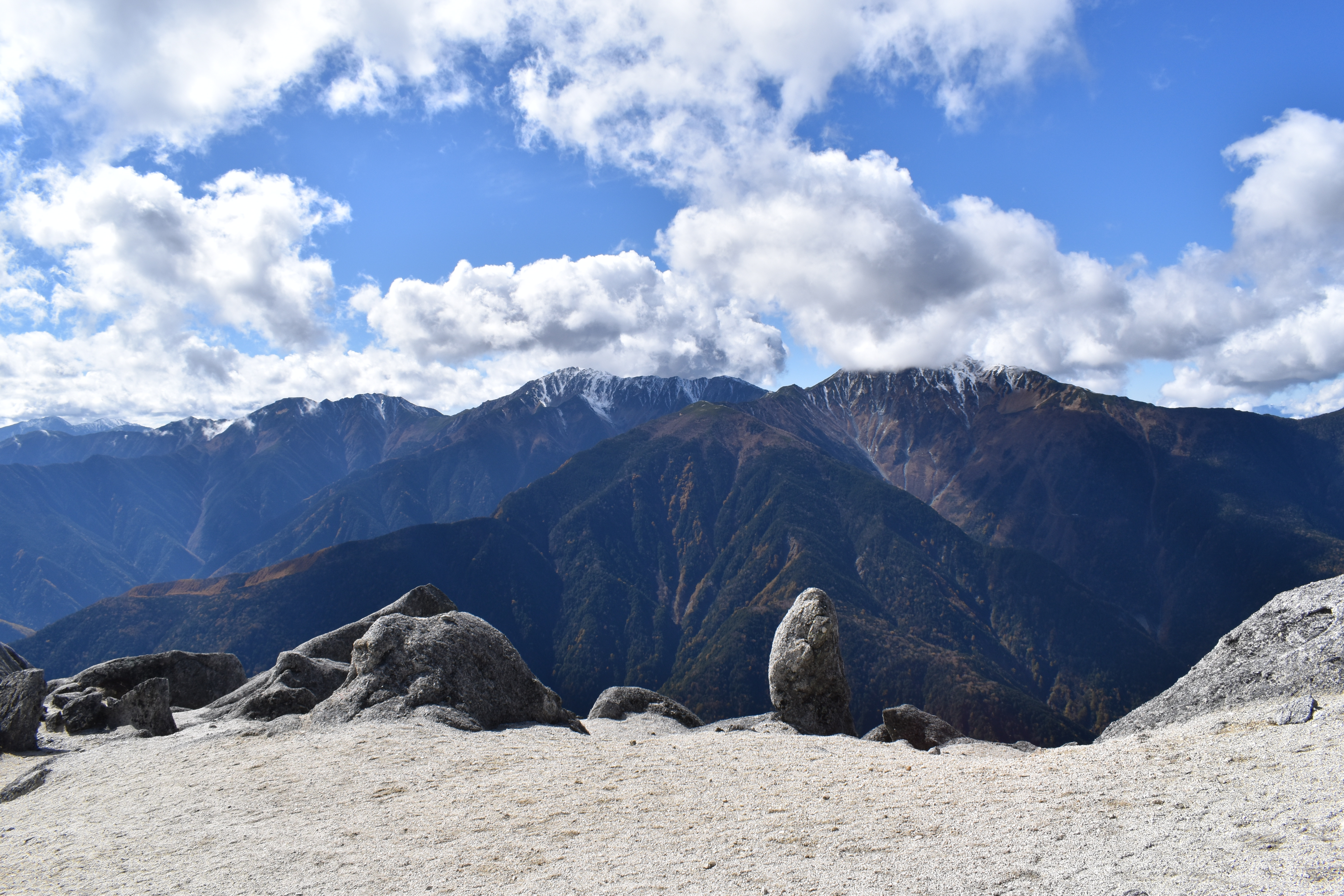 観音岳から薬師岳の稜線では北岳、間ノ岳、農鳥岳から成る白峰三山を横目に歩くことができます。なぜか北岳山頂部分の雲は1日中取れず、お目にかかることはできませんでしたが、間ノ岳や農鳥岳はちらちらっと顔を出してくれました。夜叉神峠から見る白峰三山もいいですが、鳳凰三山から見る白峰三山はより雄大さを感じることができます。白峰三山にも雪が定着してきました。真っ白になった白峰三山になるのが楽しみです♪2日間とも雨に降られることなく歩くことができ、素晴らしい景色を見ることができたので大満足でした!
