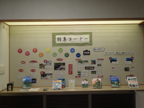 玄関ホールから入って右側の特集コーナーでは、「知ってほしい! 南アルプス国立公園について」と題して南アルプス国立公園の基本情報、ライチョウ、ニホンジカ問題について展示しています。