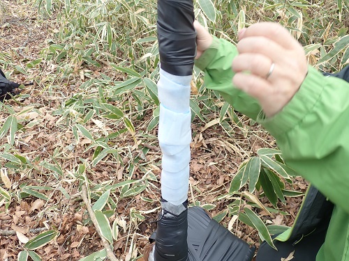 □冬期も使用する為に、凍結防止保温テープを巻く作業中