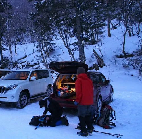 登山口には、朝の6時過ぎに到着し、薄暗い中準備をしていたら明るくなってきました。