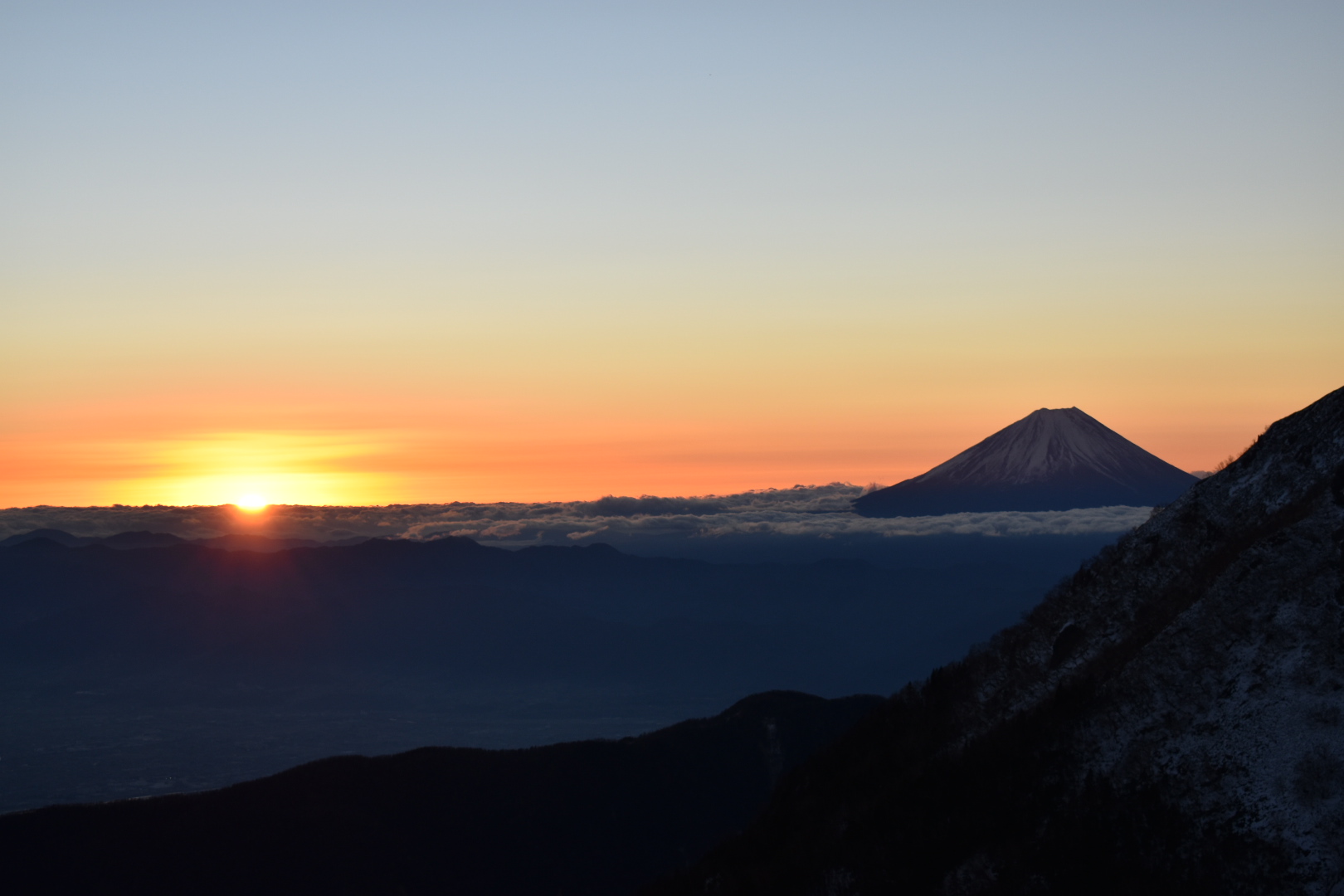 上がってきました!初日の出!日の出が上がるまで10分ほど待ちましたが、その10分が非常に長く感じられました...。ですが、素晴らしい景色を見ることができたので、頑張って登って、待って良かったと心から思いました。今年も安全に楽しく過ごせますようにと手を合わせ、地蔵ヶ岳を後にしました。