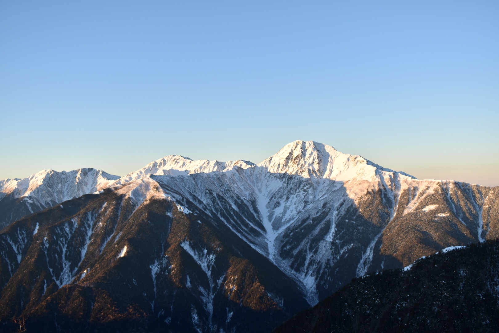 △雪が付いて白く染まった北岳