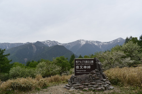 春に比べ、木々が葉を付け始め、新緑が鮮やかになります。写真は晴れていませんが、スッキリと晴れているときは、新緑の鮮やかさが増します。降雪量が多い年では4月、5月でも雪を被っている白峰三山を見ることができます。登山道沿いでは、ミツバツツジやシロバナノヘビイチゴやキバナノコマノツメなどの高山植物が咲き始めます。