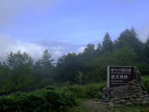 山へ若干、ガスがかかってしまっていますが、後ろにうっすら見えるのが北岳と間ノ岳です。春よりも全体的に緑が多く、夜叉神峠でも様々な種類の高山植物を多く見ることができます。また、夏期シーズンは夜叉神峠小屋の営業も始まり、小屋に泊まることもできます。(営業については要確認)小屋付近には幕営地もあるので、テント装備を背負って夏の星空を眺めるのもいいですね!