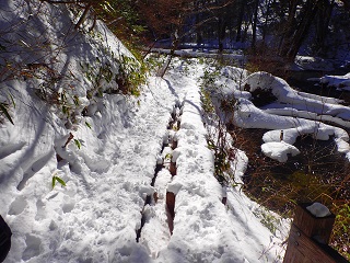 湯滝下から戦場ヶ原へは、湯川沿いに木道がありますが、高い位置だったり、細い敷板が2列に並んでいたりで、雪が積もるとスノーシューでは歩きにくかったり、隙間がわからなくなって踏み抜いたりという危険が多くなります。