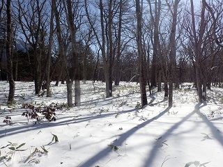 湯滝から離れるとトレースは無く、写真の様な雪の樹林地を地図と磁石で方向を判断しながら進みます。