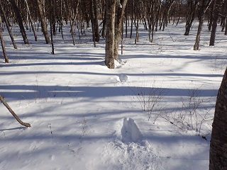 冬は雪に野生動物の痕跡が残りやすくなっています。写真はシカが雪が深くなった場所ではジャンプし、飛び跳ねるように歩いた跡のようです。