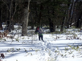 若いFさんはスノーシューを履いても膝下ぐらいまである雪を、物ともせずに進みます。若い彼には奥日光の軽い粉雪は、障害にはならないようです。