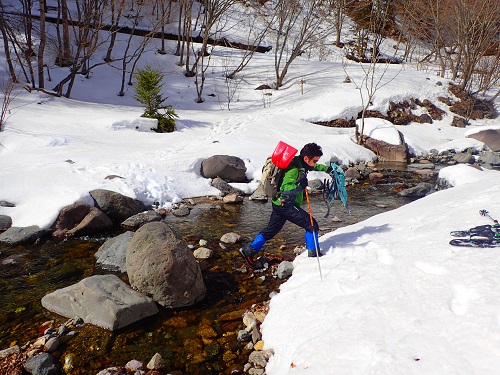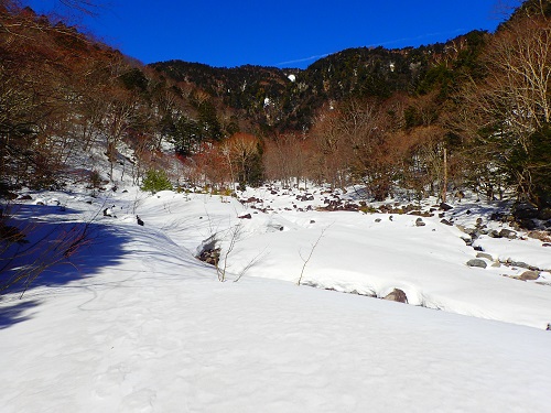 林道が途切れるところで川を渡りますが、石の上に積雪は見られず、水量も少なく楽に徒渉をすることが出来ました。